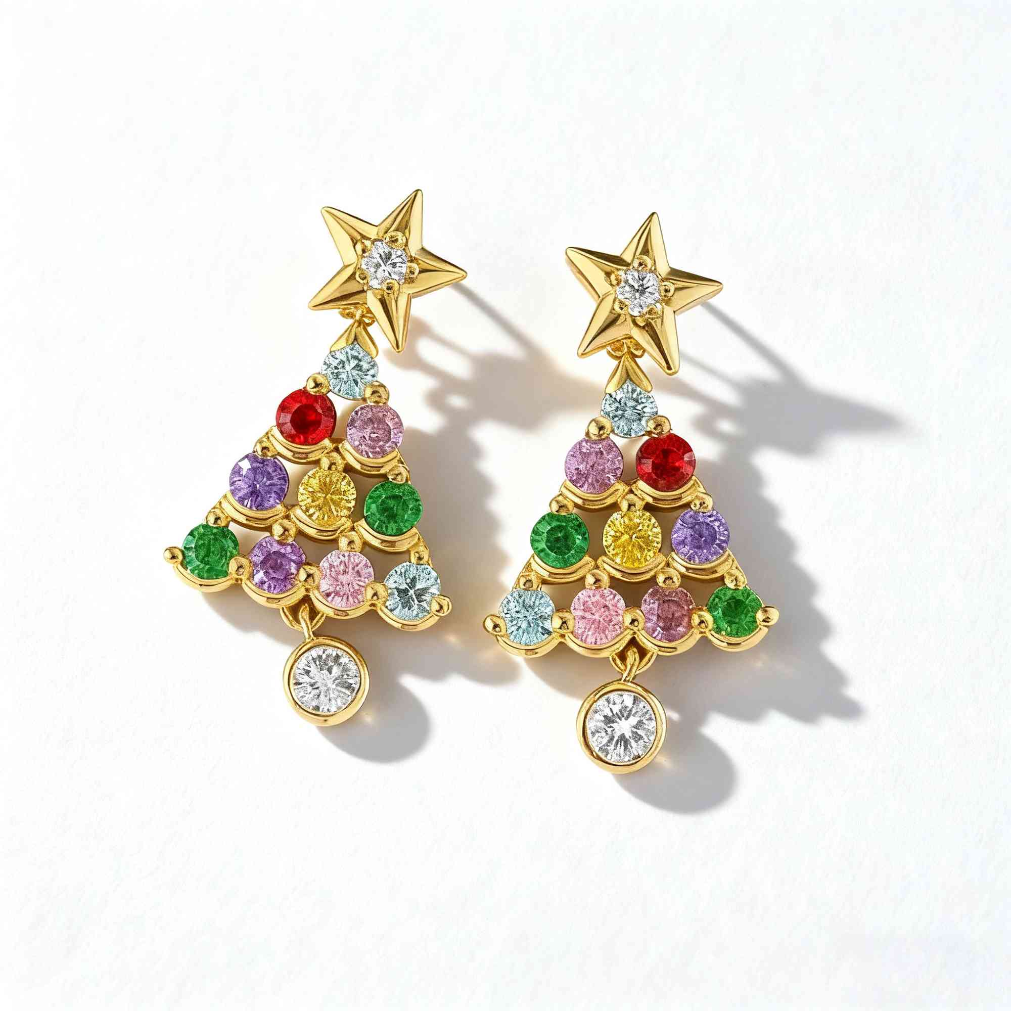 Vibrant Christmas Tree Design - These handcrafted stud earrings feature a layered Christmas tree shape, topped with a sparkling star and adorned with colorful birthstone gems (in hues like red, green, pink, and purple) plus clear accent stones. The gold-plated finish adds a warm, festive glow, making them a playful yet elegant accessory for holiday gatherings or winter outfits.