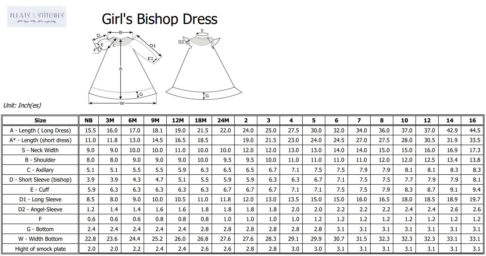 Bishops are designed to be ankle length if ordering current size. For sizes 4 and below you may need to order a size down, check our size chart (in the pictures) if you are unsure.